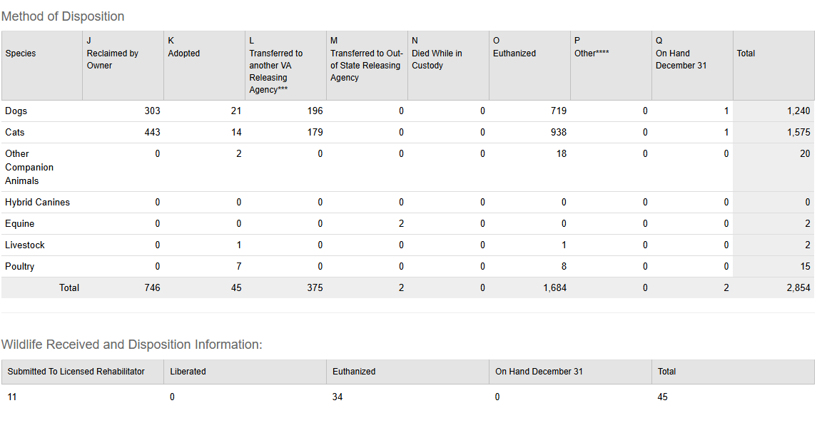 And though PETA tells the media and the public that all the dogs, cats, and other animal companions they kill are suffering when criticized, they do not tell VDACS that. Only wild animals are listed as “critically injured/dying.”