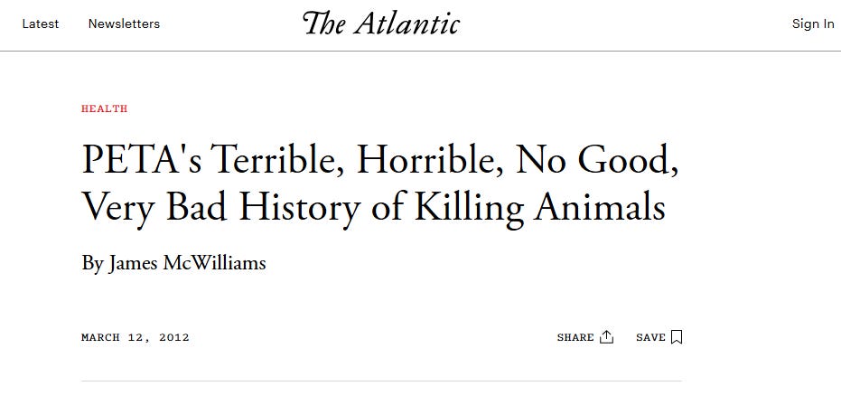 PETA has been killing animals for decades. It has been reported on by newspapers such as the New York Times and the Boston Globe, television news outlets such as CNN and Fox, and magazines such as Newsweek and The Atlantic.