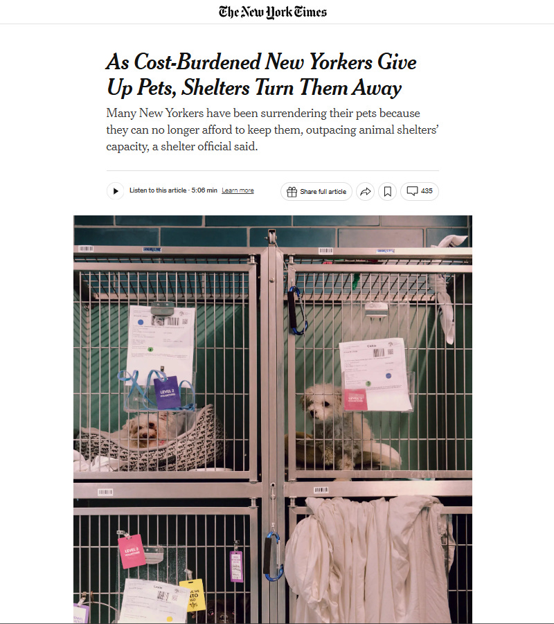Like other newspapers around the country, The New York Times reports a surge in pet surrenders as financially strained owners relinquish their cats and dogs, overwhelming the city’s animal shelters. According to reporters Liam Stack and Olivia Bensimon, the number of animals entering the system exceeds the capacity of facilities and staff, “forcing” New York City Animal Care & Control (ACC) to suspend intake due to overcrowding. None of it is true.