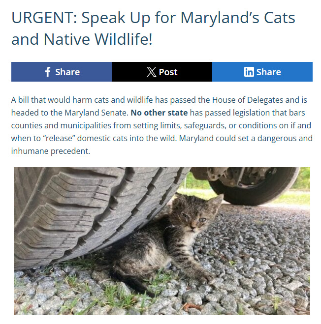 As it has so many times before, PETA is once again fighting efforts to keep cats out of pounds where they face death. It is asking its members and supporters to email Maryland legislators and urge them to vote no on HB0912, a community cat bill that encourages sterilization as an alternative to impounding and killing and gives ear-tipped/sterilized cats a free ticket out of the pound and back to their habitats.