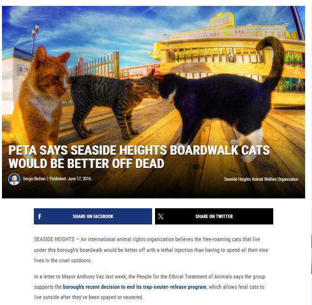 In the past, PETA was not shy about encouraging the killing of these cats, but since that argument earned it rebuke, it now couches its opposition to community cat programs as an effort to protect cats and “native wildlife.” The outcome is the same. None of this should be surprising.