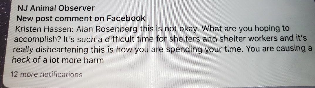 In response to Alan’s reporting, Kristen Hassen, an ardent defender of regressive pound directors, chastised him by saying his work was “not okay,” claiming it was “really disheartening this is how you are spending your time,” and called his work to hold people accountable for Saint’s abuse, killing, and coverup “one of the darkest days in the movement — the likes of which we haven’t really seen.” When someone draws the ire of animal-abuse apologists and killing-enablers, you know they’re making an impact.