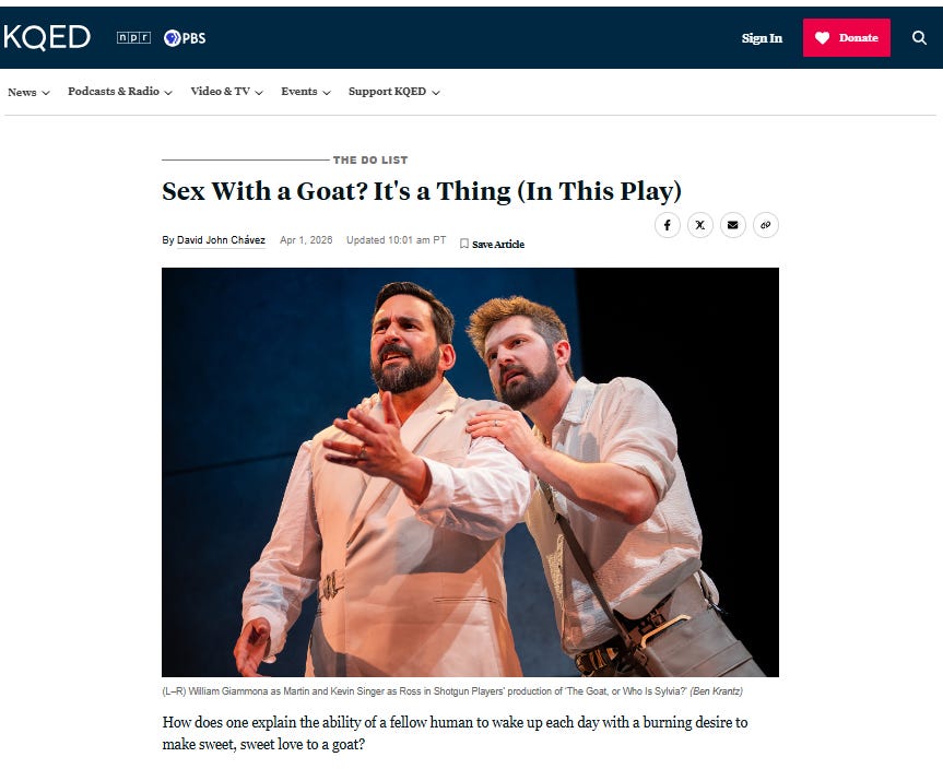 And just this week, KQED, a local PBS station, lauded a new play “about bestiality, and a human finding carnal connection with an animal that, while displaying human characteristics, has no capacity for greater yearning. But that’s not all the play is trying to convey. Ultimately, The Goat is about societal taboos, many of them centered on human sexuality — but who determines those, where is the line, and who has the right to draw that line?”