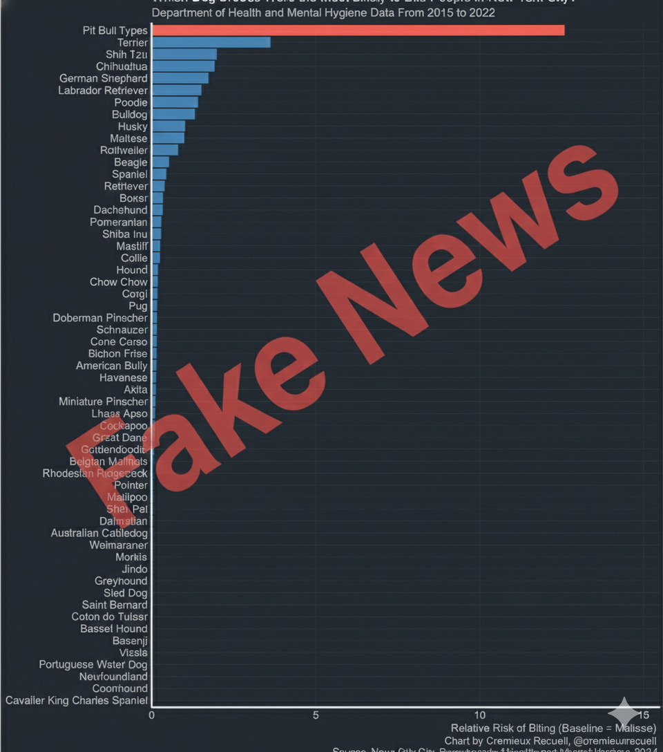 A year and a half ago, a chart circulated online purporting to show “Which Breeds Were the Most Likely to Bite in New York City,” based on data from the Department of Health and Mental Hygiene (DOHMH). Jordan Lasker, the author of the chart, claimed that “Pit Bull Types” were over 12 times more likely to bite than the Maltese. I ignored it because it constitutes statistical malfeasance, and I did not want to draw attention to it, especially given the national obsession with confirmation bias rather than truth-seeking. And it came and went without much of a ripple.